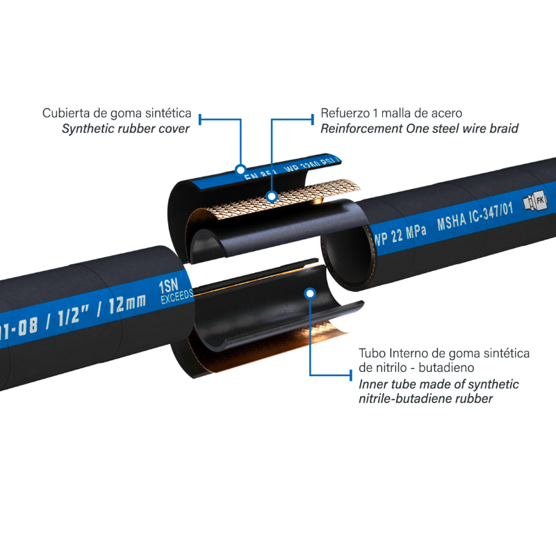 La manguera hidráulica 1SN Exceeds SAE 100R1 está diseñada para aplicaciones de alta presión que requieren confiabilidad, durabilidad y desempeño constante. Su construcción con una malla de acero de refuerzo y tubo interno resistente al aceite la hace ideal para la conducción de fluidos hidráulicos, aceites a base de petróleo, garantizando un funcionamiento seguro incluso en condiciones exigentes de trabajo.