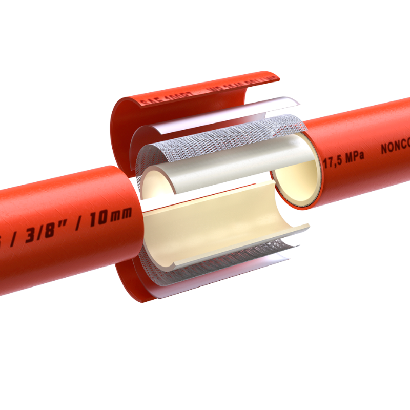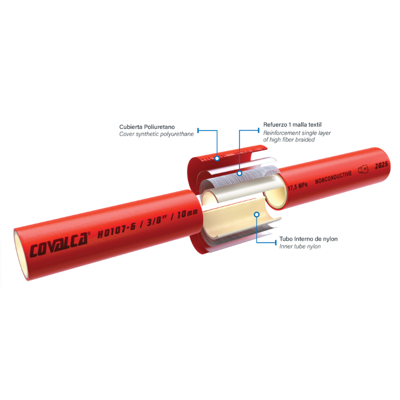Su construcción con tubo interno de nylon proporciona excelente resistencia a fluidos hidráulicos y estabilidad dimensional, mientras que su refuerzo textil permite mantener una buena flexibilidad y desempeño en sistemas hidráulicos de presión media.