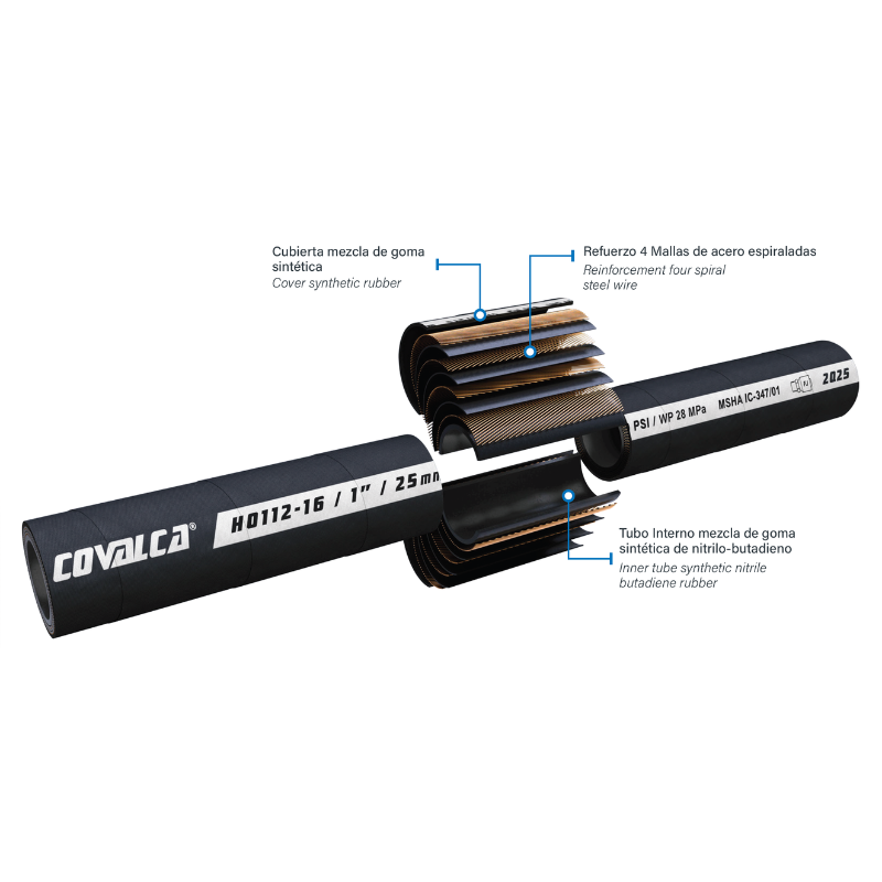 Cada manguera Covalca está diseñada para ofrecer un desempeño confiable en aplicaciones hidráulicas exigentes. A continuación, encontrarás las especificaciones técnicas, rangos de operación y aplicaciones recomendadas para garantizar una selección adecuada según tus necesidades