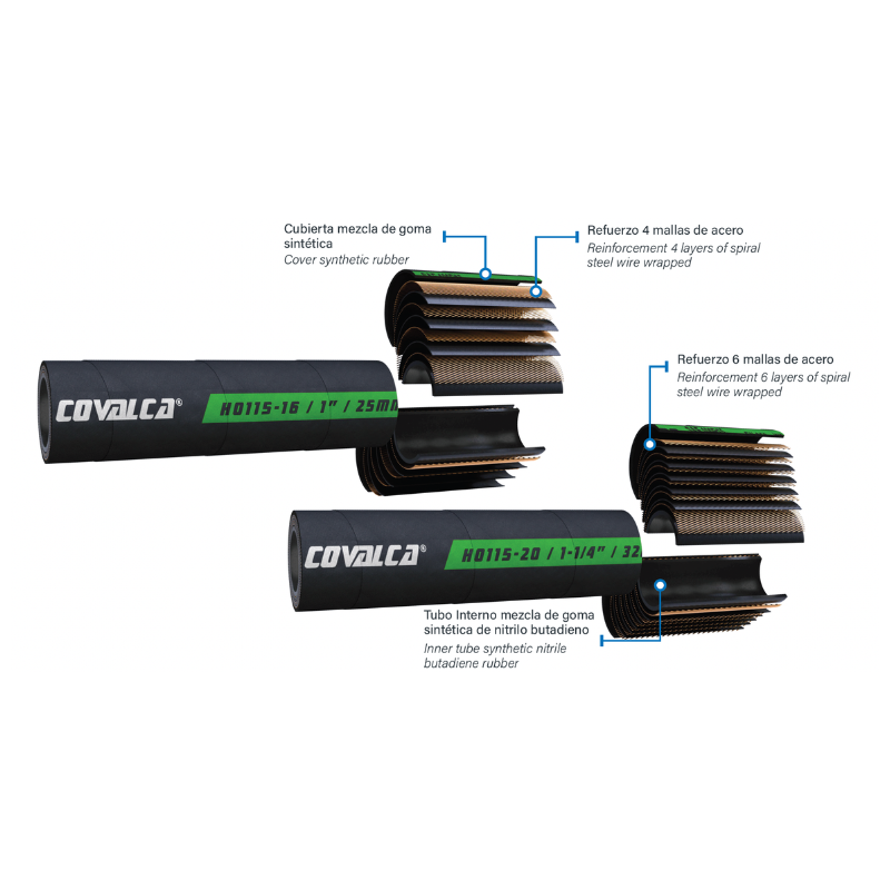 Cada manguera Covalca está diseñada para ofrecer un desempeño confiable en aplicaciones hidráulicas exigentes. A continuación, encontrarás las especificaciones técnicas, rangos de operación y aplicaciones recomendadas para garantizar una selección adecuada según tus necesidades
